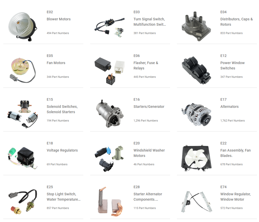 مرحل محرك المروحة ، مفتاح إشارة الانعطاف ، مفتاح متعدد الوظائف ، موزعات ، قبعات ودوارات ، محركات المروحة ، المتعري ، الصمامات والمرحلات ، مفاتيح النوافذ الكهربائية ، مفاتيح الملف اللولبي ، مشغلات الملف اللولبي ،
